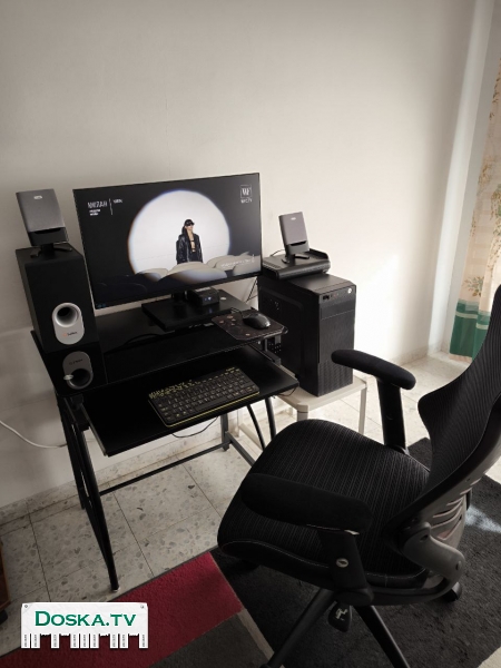 колонки, сабвуфер, клавиатура, столик компьютерный и кресло.